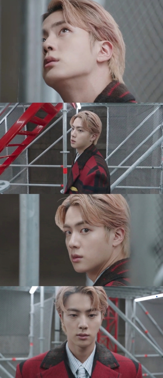 영상의 말미에는 채도가 낮은 적색과 검은색이 어우러진, 루이 비통의 로고 브로치가 박힌 코트를 입은 남자의 모습이 담겼다. 긴장감을 자아내는 배경음과 카메라 무빙에 따라 루이 비통이 추구하는 콘셉트를 가장 강하게 표현해 낸, 패션쇼의 대미를 장식하는 클로징 룩의 주인공인 진의 모습이 드러났다.