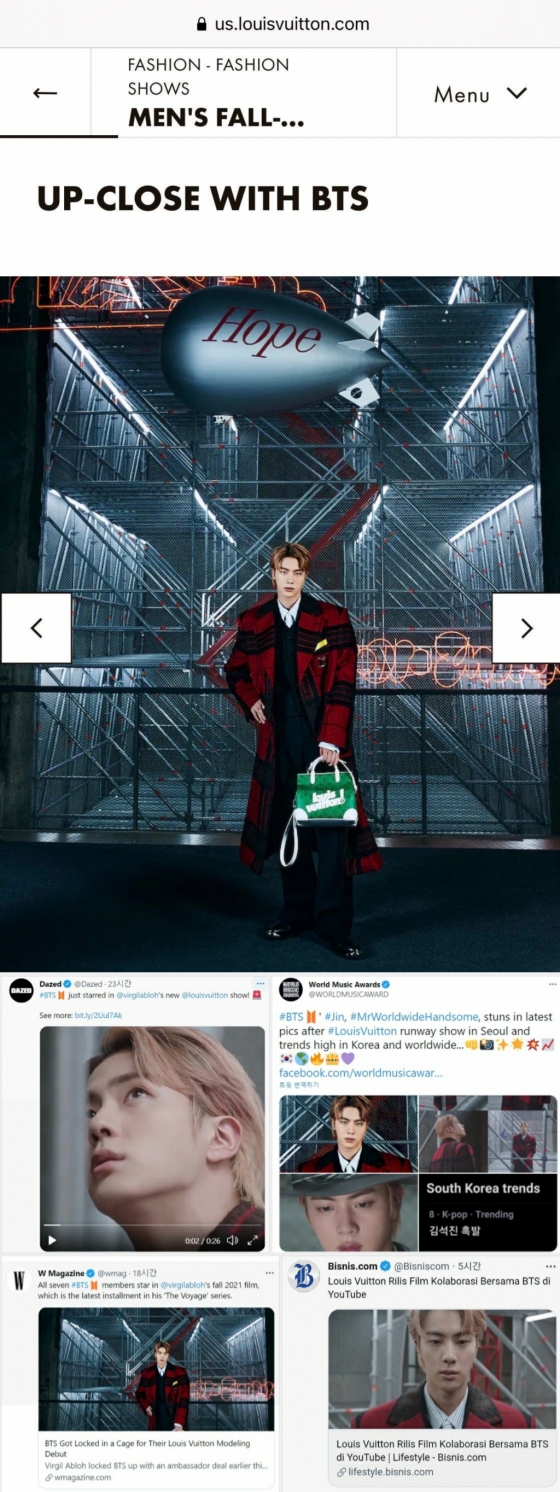 루이 비통의 미국 공식 홈페이지도 진의 콘셉트 포토로 장식됐다.