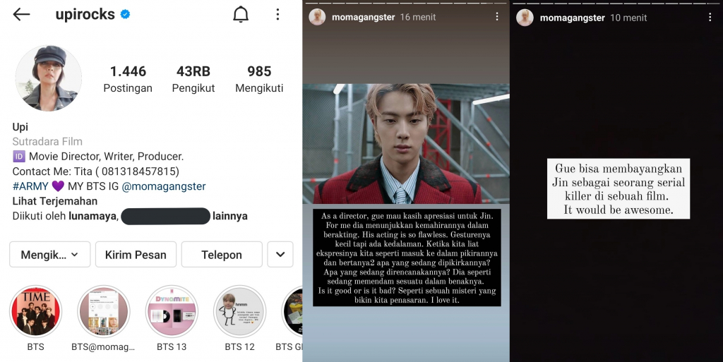 인도네시아의 각본가 겸 영화감독인 우피 아비앙토는 루이 비통 런웨이 쇼를 본 후 인스타그램 라이브를 통해 진에게 극찬을 던졌다. 우피 아비앙토는 '감독으로서 나는 진을 높이 평가하고 싶다', '그의 연기는 완벽하다. 제스쳐는 작지만 깊다', '그의 연기를 볼 때면 우리는 그의 마음 속으로 들어가는 것과 같고, 그가 무슨 생각을 하는지 궁금해한다', '우리를 궁금하게 하는 미스터리같다'며 쇼에서 보여준 진의 쇼스토퍼로서의 연기력에 대해 높이 평가했다.