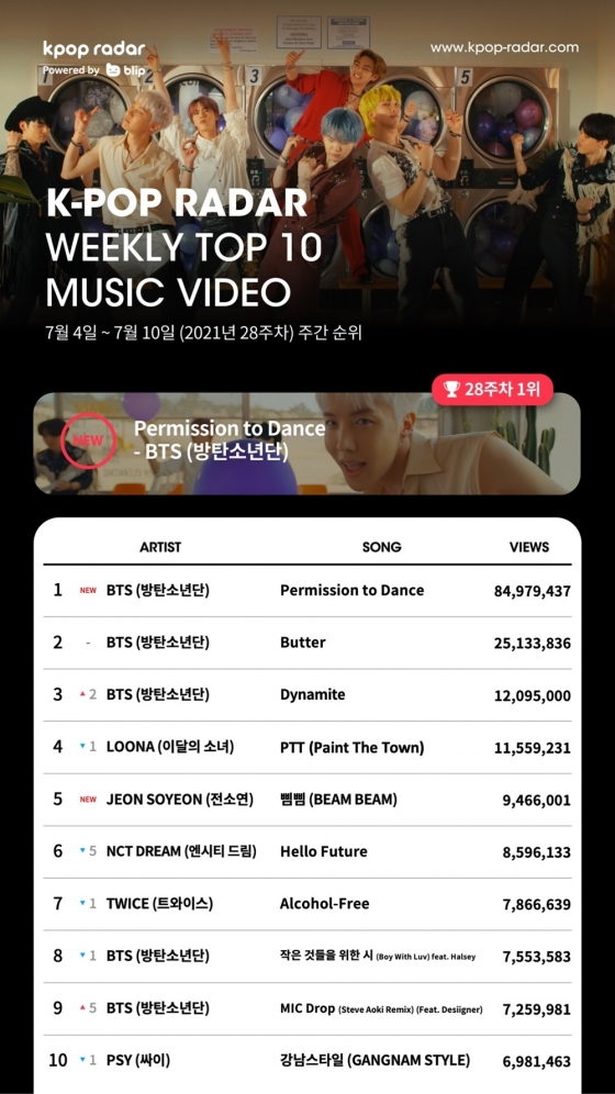 방탄소년단의 'Permission to Dance' 뮤직비디오는 케이팝 레이더 2021년 28주 차(7월 4일~7월 10일) 차트에서 84,979,437뷰를 달성하며, 일주일의 집계 기간 중 단 2일 만의 기록으로 1위를 차지했다.