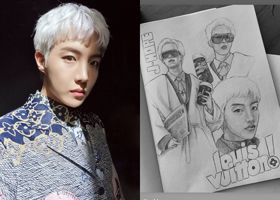 공개된 사진에는 'J-HOPE', 'Louis Vuitton!'이라는 감각적인 글자와 함께 제이홉이 루이 비통 F/W 패션쇼에 맞춰 자신의 트위터에 공개했던 사진들을 스케치로 옮긴 그림이 담겼다.