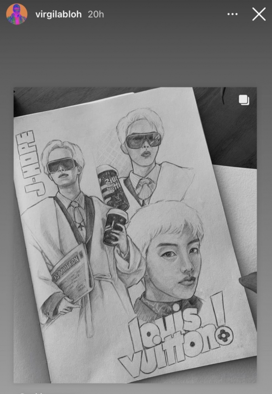 버질 아블로는 최근 자신의 인스타그램 스토리에 제이홉이 루이 비통 2021 가을-겨울 남성 패션쇼(LOUIS VUITTON Men's Fall-Winter 2021 Show in Seoul)에서 선보였던 모습을 스케치한 그림이 담긴 사진을 공개했다.