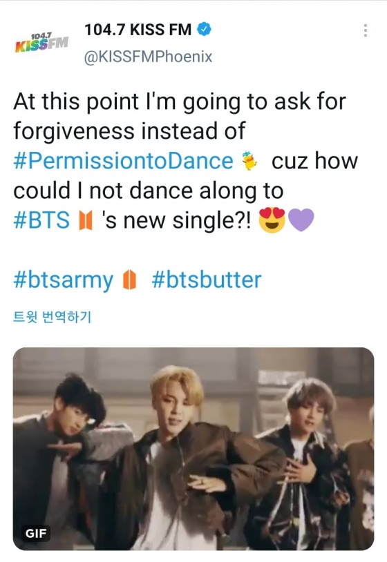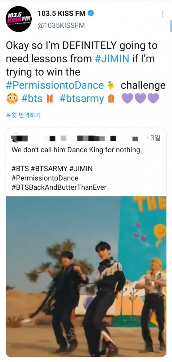또 다른 채널인 103.5 KISS FM은 지민을 포커스로 한 네티즌의 영상을 인용해 "퍼미션 투 댄스 챌린지를 성공하려면 지민의 레슨이 필요하다"고 말해 팀의 메인 댄서로서 퍼포먼스를 이끌어가는 지민의 독보적 존재감을 재확인시켰다.