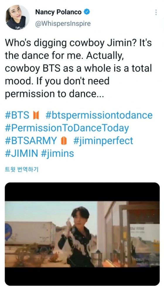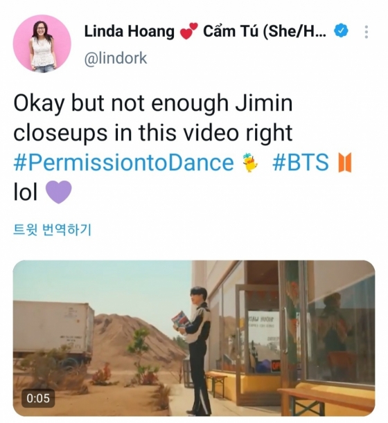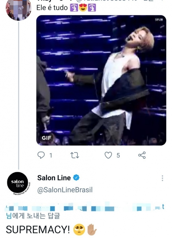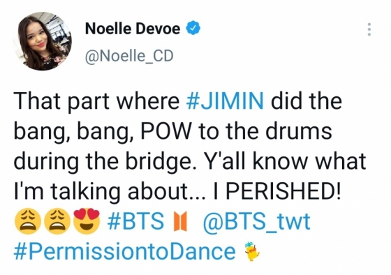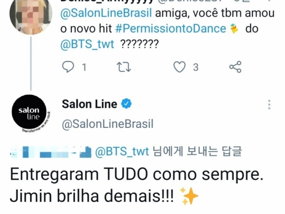 글로벌 뷰티·미용 웹사이트 Salon Line의 브라질 공식 계정은 '퍼미션 투 댄스'에 대해 "그들(BTS)은 평소처럼 모든 것을 다 내줬다''며 ''지민이 너무 눈부시다"라고 콕 집어 팬심을 전하고 곧이어 한 팬이 지민의 춤추는 이미지를 게시하자 "SUPREMACY(우월하다)"고 답해 뜨거운 호응을 얻었다.