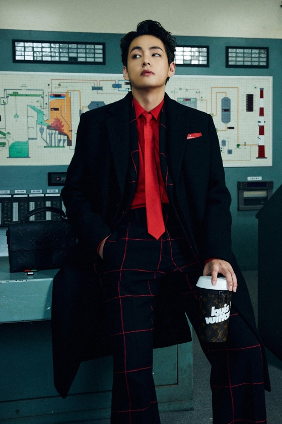 사진 속 뷔는 방탄소년단이 공식 앰버서더로 있는 루이 비통의 의상을 입고 손에는 커피컵 모양의 백을 들고 있어 시선을 끌었다.