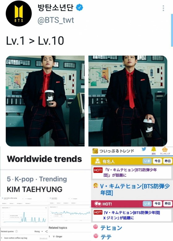 13일 뷔는 방탄소년단 공식 트위터에 "Lv.1 >Lv.10"이라는 멘트와 함께 두 장의 사진을 게재했다.