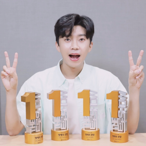 공개된 사진 속 임영웅은 큼지막한 1자가 선명한 '더 트롯쇼' 명예의 전당 트로피 4개를 앞에 두고 양손으로 브이(V) 자를 그리고 있다. 또 다른 사진에서는 입을 크게 벌리고 4관왕을 자축했다.