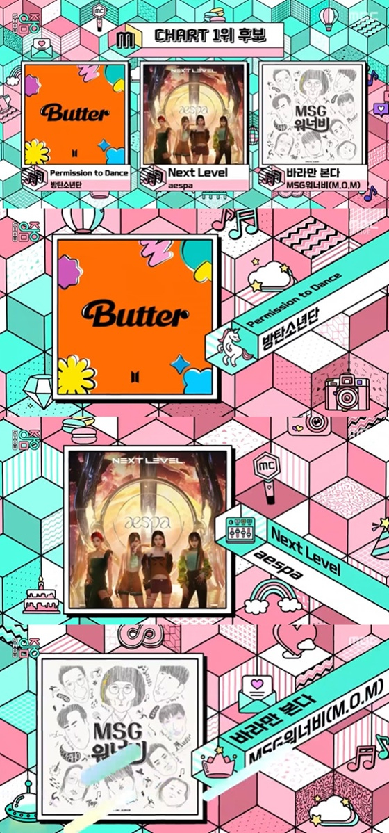 17일 오후 방송된 MBC '쇼! 음악중심'에서는 방탄소년단 'Permission to Dance', 에스파 'Next Level', MSG워너비(M.O.M) '바라만 본다'가 7월 셋째주 1위 후보에 올랐다.