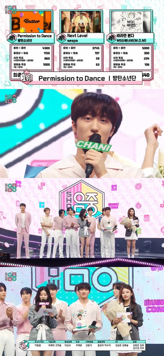17일 방송된 MBC '쇼! 음악중심'에서는 방탄소년단의 'Permission to Dance'(퍼미션 투 댄스)가 에스파의 'Next Level'(넥스트 레벨), MSG워너비(M.O.M)의 '바라만 본다'를 꺾고 1위에 올랐다.