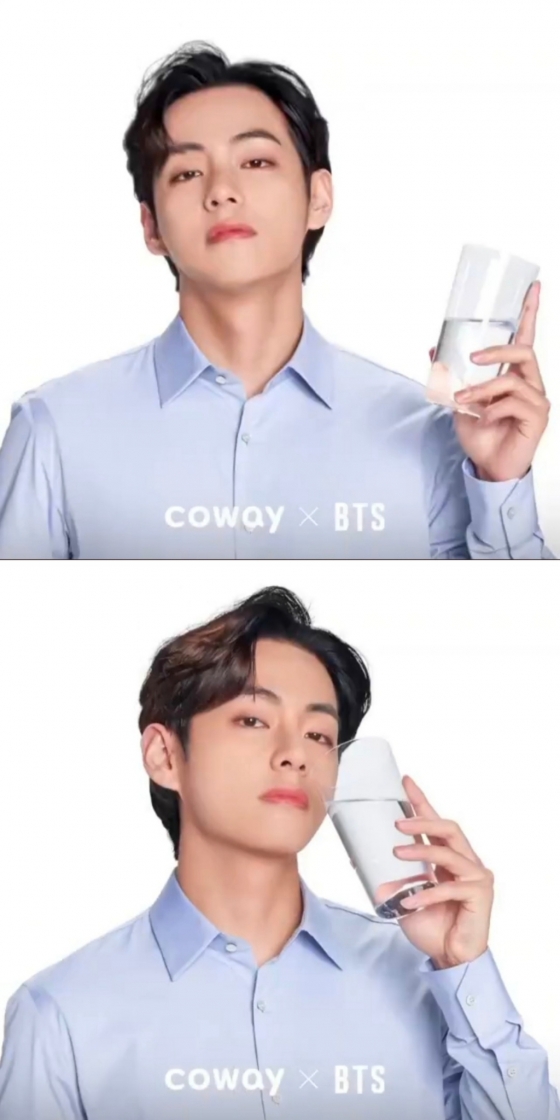 물컵을 잡은 크지만 길고 가늘어 예쁜 섬섬옥수는 뷔의 독보적 잘생김을 돋보이게 하며 광고 천재의 명화같은 한 컷을 완성시켰다.