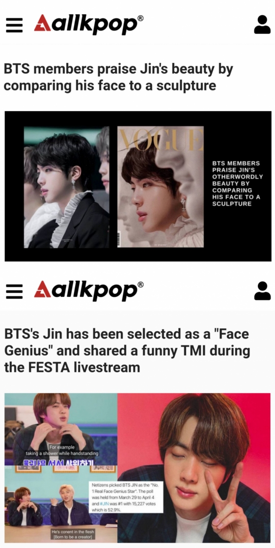 미국 매체 올케이팝은 최근 "방탄소년단 멤버들이 진의 얼굴을 조각상에 비유하며 진의 미모 극찬", "방탄소년단 진, 얼굴 천재로 선정되고 페스타 영상에서 재미있는 TMI를 공유하다"는 기사를 통해 방탄소년단 멤버들이 진의 외모를 극찬한다는 소식을 실었다.