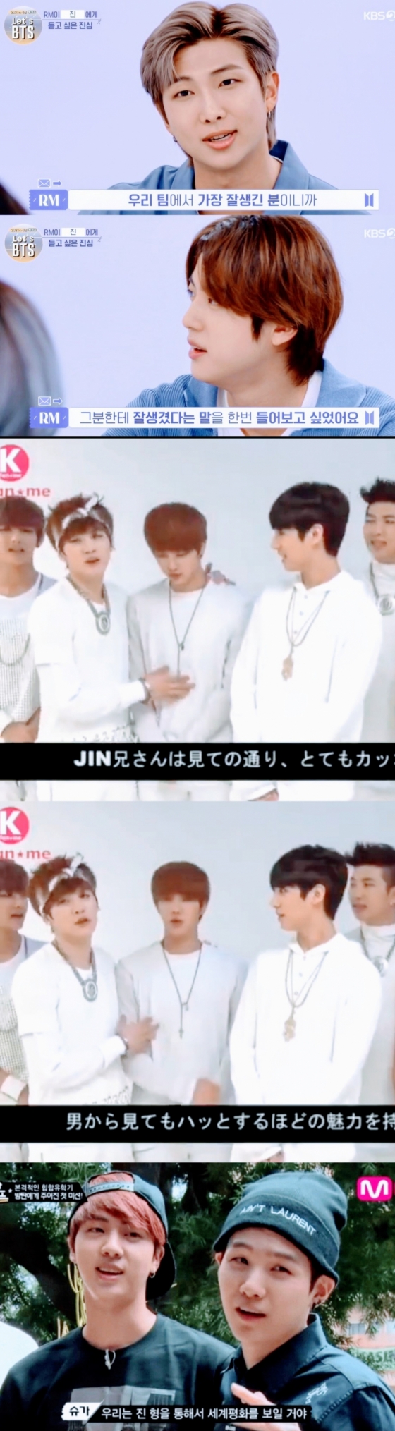 리더 RM은 지난 3월 KBS2에서 방송된 '2021 스페셜 토크쇼 - Let's BTS'에서 진에게 잘생겼다는 말을 듣고 싶다는 귀여운 속내를 밝히며 "우리 팀에서 가장 잘생긴 분이니까 그분한테 한번 잘생겼다는 말을 듣고 싶었어요"라고 전했다.