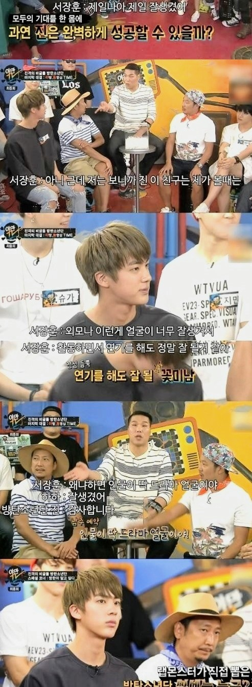 특히 방송인 서장훈은 Mnet '야만TV'에 출연한 방탄소년단을 본 후 "진이 제일 잘생겼어"라며 "진 이 친구는 제가 볼 때는 외모나 이런게 얼굴이 너무 잘생겨서 활동하면서 연기를 해도 정말 잘될거 같아. 왜냐하면 인물이 딱 드라마 얼굴이야"라고 진의 실물을 본 소감을 전했다.