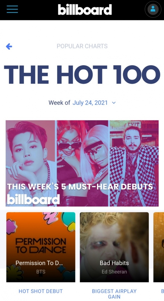 빌보드는 공식 홈페이지를 통해 가장 먼저 방탄소년단의 대표 얼굴인 지민의 단독 사진을 게시하고, BIA & 니키 미나즈(Nicki Minaj), 포스트 말론(Post Malone)을 차례로 섬네일로 지정해 차트 순위를 공개했다.