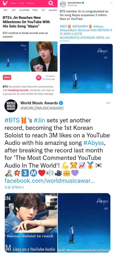 유럽의 빌보드라고 불리우는 세계적 권위의 '월드 뮤직 어워드'(WMA)는 공식 SNS계정을 통해 "지난 달 'The Most Commented YouTube Audio In The World(전 세계에서 가장 댓글이 많이 달린 유튜브 오디오)의 기록을 깬 이후 BTS의 Jin이 놀라운 곡 'Abyss'로 한국인 최초로 유튜브 오디오에서 '좋아요'를 300만 달성하며 또 하나의 기록을 세웠다"란 메세지와 함께 귀여운 이모티콘를 덧붙여 깊은 애정을 담아 축하인사를 전했다.