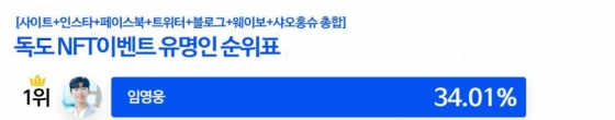 임영웅은 '엔버월드(NvirWorld)'에서 진행하는 국민 참여형 독도 NFT 기부 캠페인의 댓글 이벤트를 통해 진행 중인 '독도 NFT 작품에 이름을 함께 올리고 싶은 스타' 중간 결과, 24일 오전 9시 기준 34.01%로 1위를 기록했다.