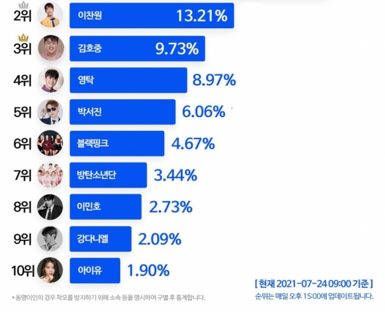 이어 2위 이찬원(13.21%), 3위 김호중(9.73%), 4위 영탁(8.97%), 5위 박서진(6.06%), 6위 블랙핑크(4.67%), 7위 방탄소년단(3.44%), 8위 이민호(2.73%), 9위 강다니엘(2.09%), 10위 아이유(1.90%) 순이었다.