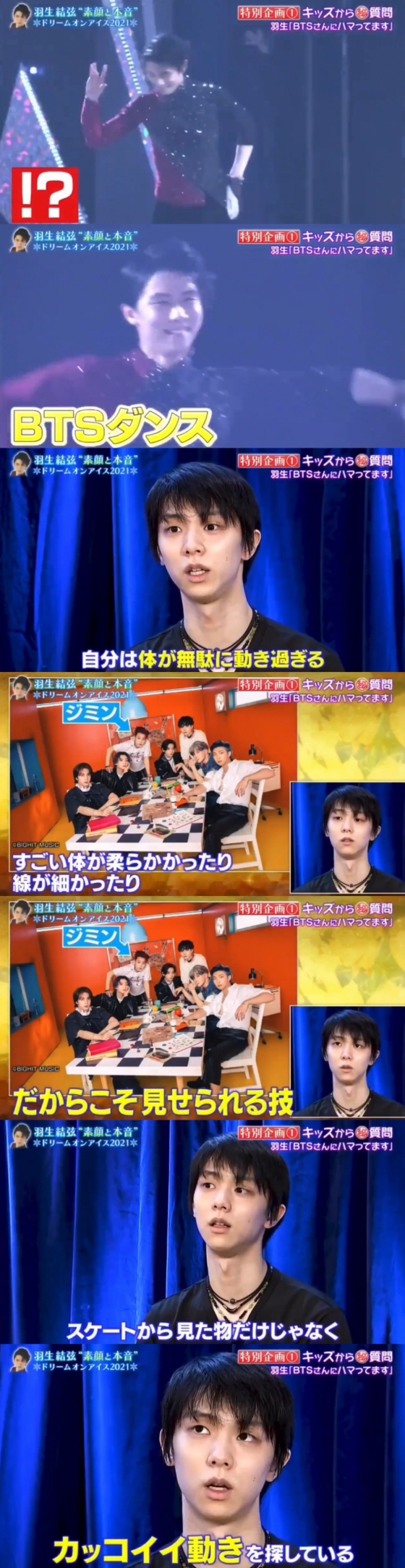 일본 남자 싱글 피겨 스케이팅 선수 하뉴 유즈루(羽生結弦·27)는 이달 초 일본 요코하마 KOSE 신요코하마 스케이트 센터에서 열린 아이스쇼 '드림 온 아이스 2021'(Dreams On Ice 2021) 엔딩에서 방탄소년단 'Dynamite' 뮤직비디오 속 지민의 댄스 파트를 따라해 눈길을 사로잡았다.