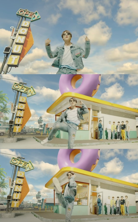 하뉴는 지민이 'Dynamite' 뮤직비디오에 한대로 춤을 춘 뒤 미소를 지었다. 많은 연습을 한듯 보였다.