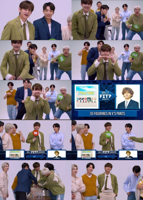 뷔에게 주어진 게임은 35개의 피규어를 팬츠에 넣는 것이었다. 지미 팰런이 도전하겠냐고 묻자 뷔는 단호하게 'NO'를 선언했다가 'YES'로 바꾸는 밀당으로 웃음을 선사했다.