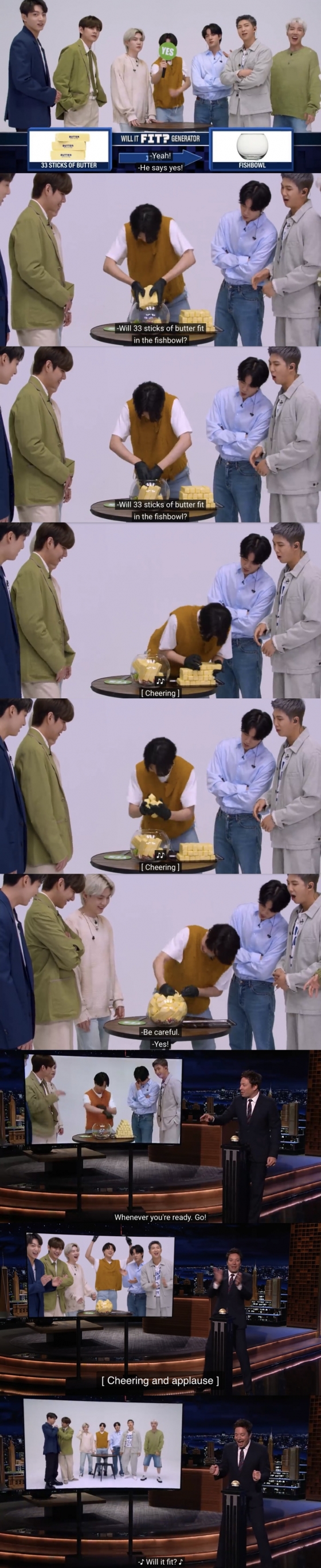지민을 시작으로 작은 컵케이크에 초 꽂기, 티셔츠 여러벌 입기, 작은 가방에 바나나 넣기 등 멤버들 모두 게임에서 성공해, 지미 팰런은 나초 치즈가 가득한 세탁기 안으로 들어가 '버터' 앨범을 들어보이는 대형미션 벌칙수행으로 큰 웃음을 주며 게임을 마무리 했다.