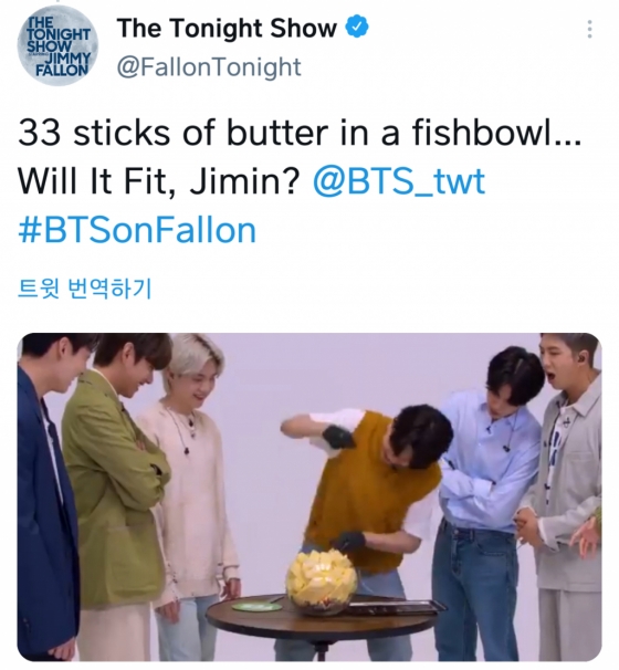 게임 중 지민이 주먹으로 버터를 치자 "조심해"라고 애정어린 멘트를 보낸 지미팰런은 지민이 게임에 성공하자 크게 환호하며 기뻐했다.