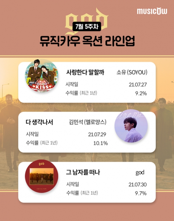 한편 금주라인업으로는 엑소 첸 'Rainfall', 소유 '사랑한다 말할까', 임도혁 '이별이란게 뭐라고', 멜로망스 김민석 '다 생각나서', god 지오디 '그 남자를 떠나'다. 'Rainfall'은 이정재, 신민아 주연의 드라마 '보좌관' OST로도 인기를 모은 곡이다.