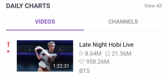 제이홉의 브이라이브는 864만 조회수에 댓글 2156만 개를 기록했다. 하트수는 무려 9억 5826만 개에 달했다.
