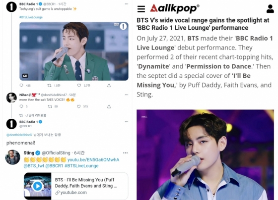 'BBC 라디오 1' 공식 계정은 뷔의 목소리에 대해서는 '경이롭다!'(phenomenal!)며 극찬을 아끼지 않았다. 또 이전의 주황색 수트를 입은 뷔를 언급한 것에 이어 '태형의 수트 게임은 끝나지 않았다'며 그린 수트를 입은 뷔의 사진을 게재해 눈길을 끌었다. 원곡자 스팅 또한 자신의 공식 SNS에 무대 링크를 공유하며 박수치는 이모지를 게재해 놀라움을 안겼다.