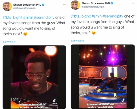26일 숀 스톡맨은 지민의 고유 해시태그인 '#jimin'과 함께 자신의 트위터에 "#serendipity 내가 좋아하는 노래 중 하나. 다음에는 그들의 노래 중 어떤 노래를 부르고 싶으신가요?"라며 짧은 동영상을 공개했다.