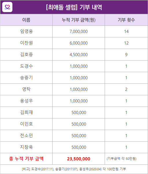 임영웅은 총 14회 기부로 누적 기부금액 700만 원을 달성했다. 임영웅의 이름으로 '밀알복지재단'에 전달될 기부금은 코로나19로 고립된 장애인을 위한 기금으로 쓰인다. '최애돌 셀럽' 총 누적 기부금액은 2350만 원이다.