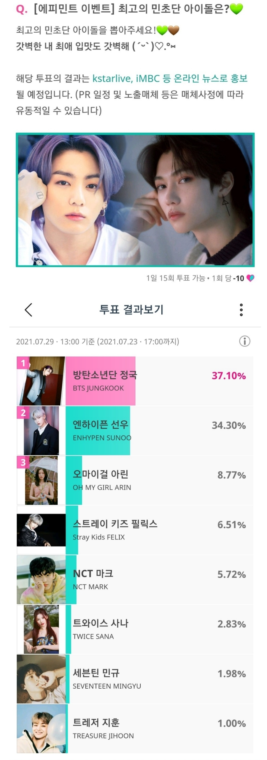 해당 투표 2위로는 엔하이튼 선우(34.3%), 3위로는 오마이걸 아린(8.77%), 4위는 스트레이 키즈 필릭스(6.51%), 5위는 NCT 마크(5.72%)로 나타났다.