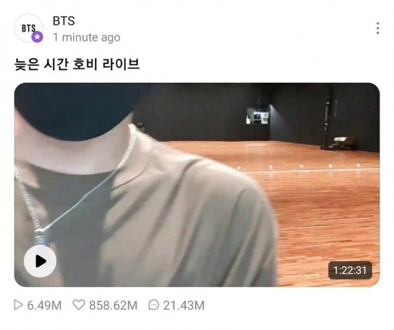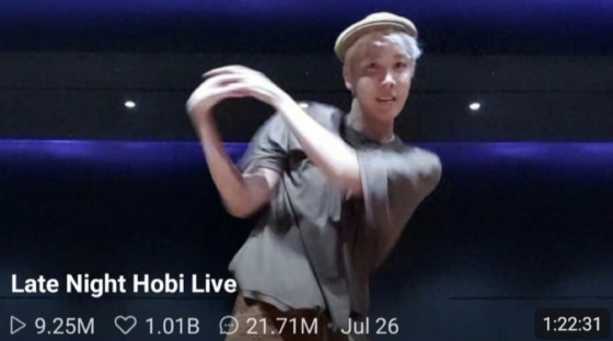 제이홉이 지난 26일 새벽 생방송으로 진행한 '늦은 시간 호비 라이브'(Late Night Hobi Live)는 30일 좋아요 10억 개를 달성했다. 2021년 방송된 방탄소년단 브이라이브 라이브 방송 중 두 번째로 많은 좋아요 수 기록이다.