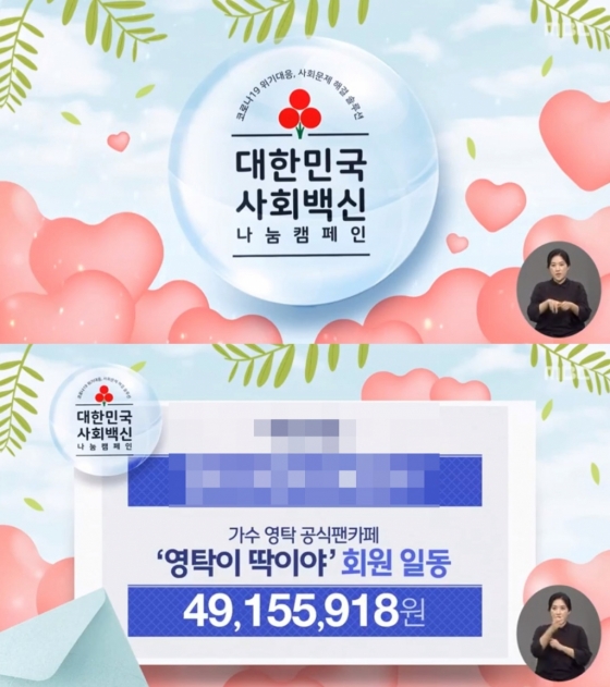 영탁 공식 팬카페 '영딱이 딱이야' 회원들은 30일 MBC와 사랑의열매가 진행하는 대한민국 사회백신 나눔 캠페인에 4915만 5918원을 기부했다.