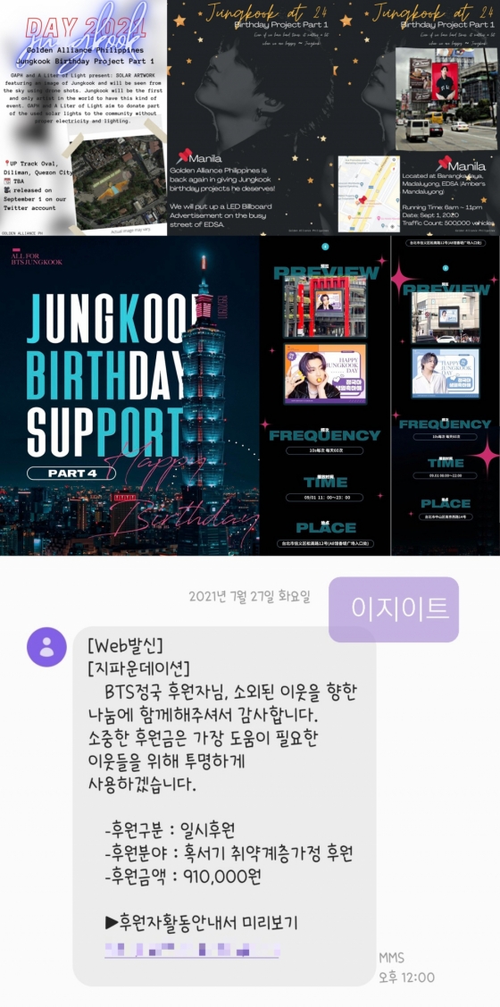 국내 팬 계정 '이지이트'는 지난 27일 "입덕하고 매년 정국이 생일마다 해오던 기부인데 요즘 같은 어려운 시기에 견디기 힘든 여름을 보내고 계실 분들께 작은 도움을 드리고 싶다" 며 국제개발협력NGO 지파운데이션에 'BTS 정국' 이름으로 기부했다고 트위터 계정을 통해 인증했다.