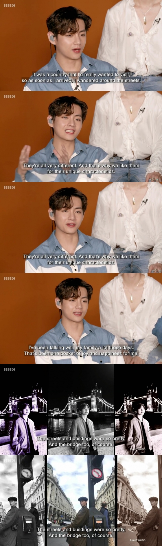 조각 같은 비주얼로 시선을 사로잡은 뷔는 "정말 와보고 싶었던 곳이라서 영국에 오자마자 런던 거리부터 걸었다"고 답했고, 영국 공연을 위해 방문했던 그 때를 회상하며 따뜻한 미소를 보였다.