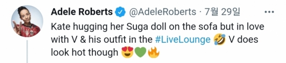한편 진행자인 아델 로버츠는 '케이트(배우이자 작가)가 라이브 라운지의 뷔를 보고 사랑에 빠졌다'는 글을 자신의 SNS에 게재해 무대 후 뷔의 핫한 존재감을 여실히 보여줬다.