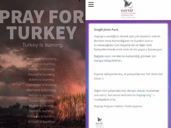 'JIMIN UNITED' 역시 '터키는 이제 집, 건물, 숲, 생계, 동물 및 많은 생명을 포함한 여러 마을에서 우리의 도움이 필요하다'며 'HAYTAP 동물 권리 연맹에 지민의 이름으로 기부하기로 결정했다'고 전하고 해시태그 #PrayForTurkey (터키를 위해 기도해 주세요), #TurkeyIsBurning(터키가 불타고 있다) 해시태그를 통해 심각한 재난 상황을 알리며 기부 독려에 앞장섰다.