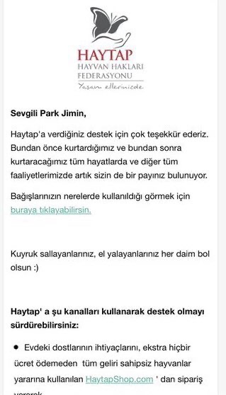 지민의 팬 베이스 'JIMIN DATA'는 '지난 이틀 동안 터키의 숲, 집, 도시가 불타고 수천 명의 사람과 동물이 고통을 겪고 있다'며 '도움이 필요한 동물들을 돕기 위해 지민의 이름으로 HAYTAP 동물권 연맹에 기부하기로 결정했다'고 기부 취지를 알렸다.