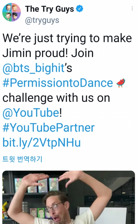 유튜브 구독자가 700만 명이 넘는 미국 유명 코미디 그룹 The Try Guys는 'Permission to Dance' 챌린지에서 지민을 자랑스럽게 만들고 싶다며 애정을 나타냈다.