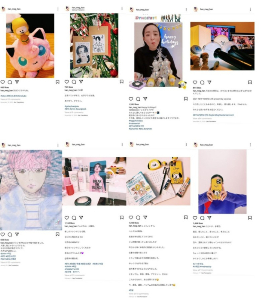 아미(ARMY)로 잘 알려진 일본 유명 성우이자 배우인 한 메구미(潘はんめぐみ)는 자신의 포스트를 지민의 노래와 사진, 그림, 굿즈 등으로 채워 애정을 한껏 드러냈다.