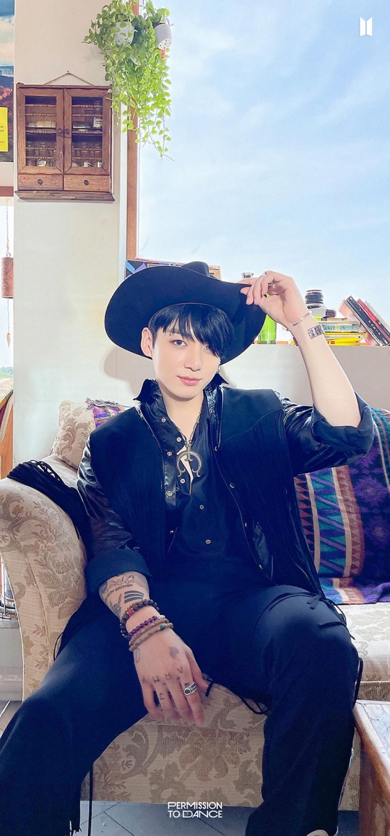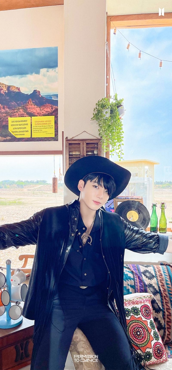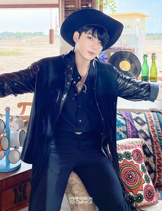 정국은 블랙 카우보이 모자, 가죽 재킷, 팬츠를 입고 시크한 남성미를 뿜어내며 마치 서부 영화 속 한 장면을 연상케 만들었다.