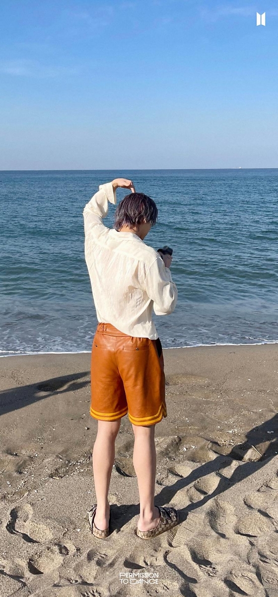 정국은 해변 모래사장에서 손 머리 위 하트를 그려 귀엽고 로맨틱한 무드를 풍겼다. 넓은 어깨가 돋보이는 뒤태는 설렘을 안겼다.
