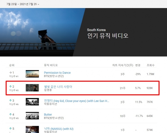 임영웅이 지난 3월 9일 공개한 '별빛 같은 나의 사랑아' 뮤직비디오는 7월 마지막 주(7월 23일~7월 29일) 한국 유튜브 인기 뮤직비디오 톱2에 올랐다. 전주(7월 16일~7월 22일) 3위에서 한 계단 상승했다.