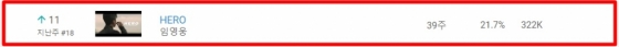 눈길을 끄는 것은 'HERO' 뮤직비디오의 역주행이다. 4일 기준 1600만 뷰 대를 기록 중인 'HERO'는 전주 대비 무려 18계단 상승하며 이번 주 톱11에 올랐다. 'HERO' 역시 유튜브 인기 뮤직비디오 톱100에 39주째 차트인하며 사랑받고 있다. 톱10 진입도 노려볼만하다.