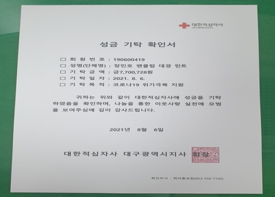 대구경북지역 장민호 팬클럽인 대경 민트는 가수의 생년월일을 기념한 금액 770만 728원을 대구적십자사에 기탁했다. 기탁금은 코로나19 극복을 위한 활동에 사용될 예정이다.
