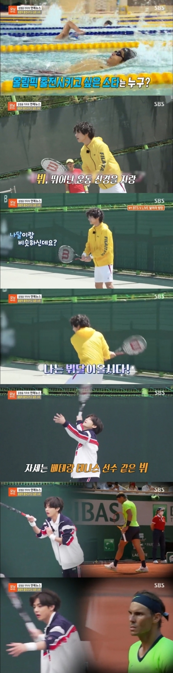 또 자세가 완벽한 테니스 선수 같다며 "올림픽에 나가서 테니스 황제의 자리 한번 겨뤄볼까요"라는 멘트와 함께 뷔와 테니스 황제 나달의 모습을 나란히 내보내 눈길을 끌었다.