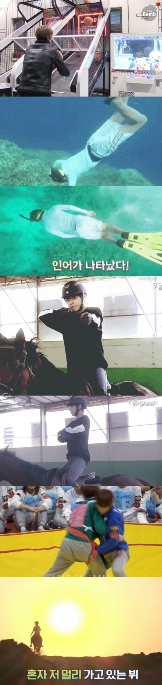 또 드라마 '화랑' 촬영을 위해 처음 접한 승마 역시 시작과 함께 능숙한 자세를 선보이더니 2018년 '본보야지'를 촬영한 몰타에서는 백마 탄 왕자님 같은 자태로 석양과 함께 영화 속 한 장면을 연상케 하는 멋진 연출을 완성시키며 멤버들로부터 "멋있다", "뷔가 하드캐리한다"는 뜨거운 칭찬을 받았다.