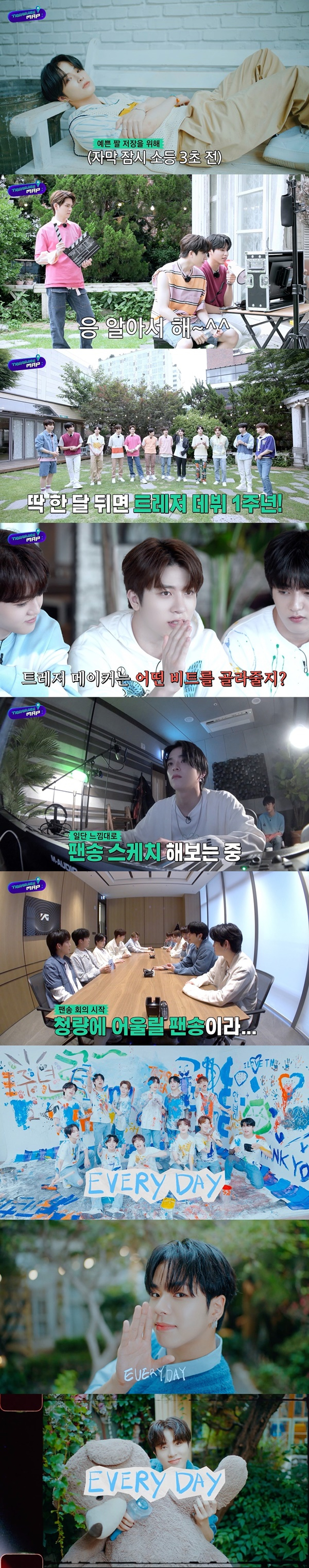 아이돌그룹 트레저가 데뷔 1주년을 맞아 팬송 'EVERYDAY'를 깜짝 선물했다. 셀프 세리머니가 아닌 트레저 메이커(팬덤)의 1년을 축하하는 곡이자 '언제 어디서나 팬들 곁에 있겠다'는 멤버들의 진심과 의지가 담긴 노래다. 특히 이는 트레저와 팬들이 함께 만든 곡이라는 점에서 그 의미를 더했다.