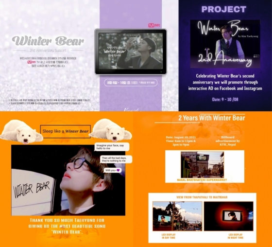 또다른 팬베이스 'V BTS Bolivia'는 8월 9일부터 10일 양일간 사운드클라우드의 '윈터베어' 음원으로 연결되는 '페이스북(Facebook)' 및 '인스타그램(Instagram)'의 양방향 광고를 진행했고 'KTH Nepal'에서는 10일 네팔 카트만두에 광고판을 전시하며 축하를 전했다.